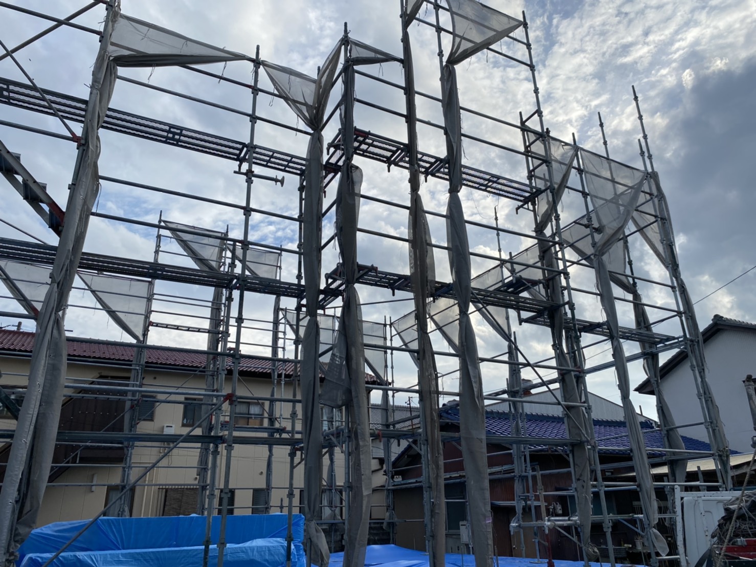 新築工事のシートを直し足場繋ぎをつけました。